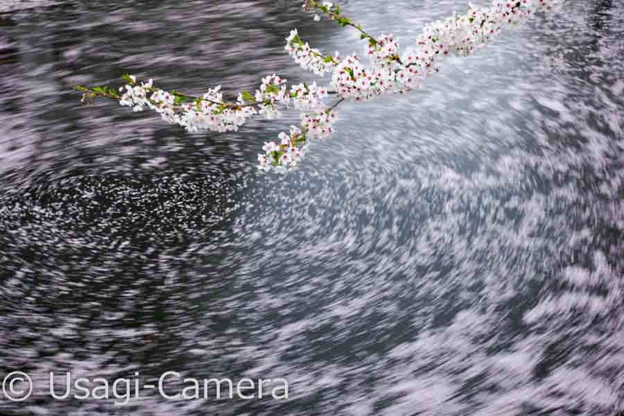 ss4秒で撮影。風は時折弱く吹く程度で、ほぼ無い状況。水面の花びらが動いているのは、堀の排水溝が近くにあるから。シャッタースピードを色々と変えながら、花や枝がなるべく止まるタイミングを狙って撮影。