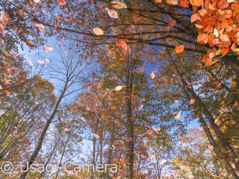 撮った写真を上下逆さまにして、右上の葉っぱが舞い落ちているような構図にしてみました。帰る途中、行ったことのない脇道を見つけ、最後に少し覗こうと思って歩いてみたら、すぐに小さな池とリフレクションに出会えました。