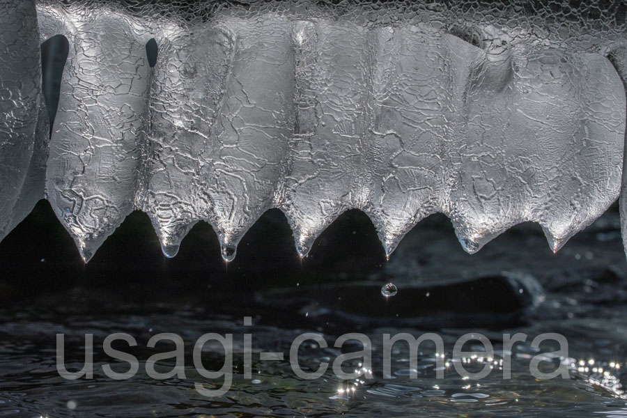 氷から滴る水滴を撮りたくて狙った一枚。水滴は頻繁に落ちてくれていました。午後の斜光がきれいに入っていましたが、いつ雲に隠れて光が無くなるかわからない状況だったため、とても焦りながら撮ったのを覚えています。